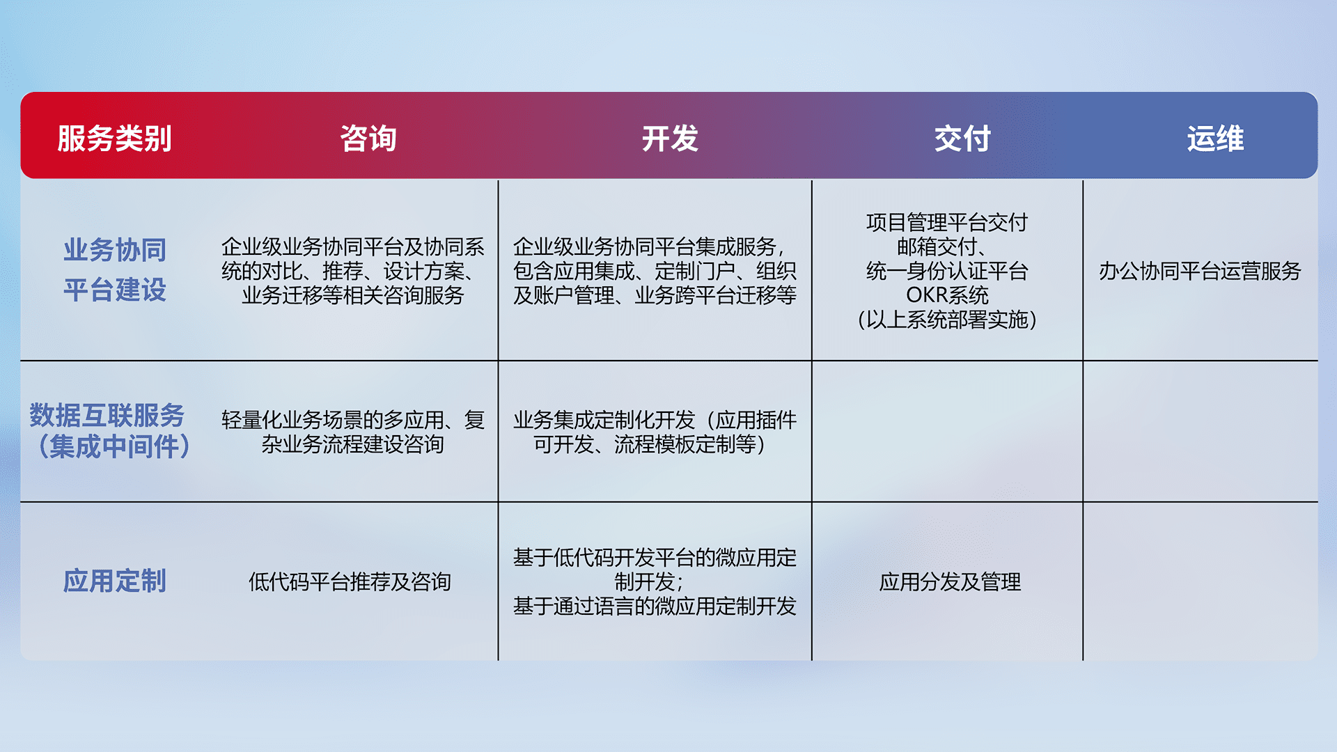 针对钉钉、、、企微、、、IDaas等平台级产品提供产品的规划、、、、方案、、、、交付、、定制化开发等服务,,实现如统一协同办公、、智能客户服务、、混合会议管理、、、智能数据查询、、、、等业务场景,,实现数字化转型。。